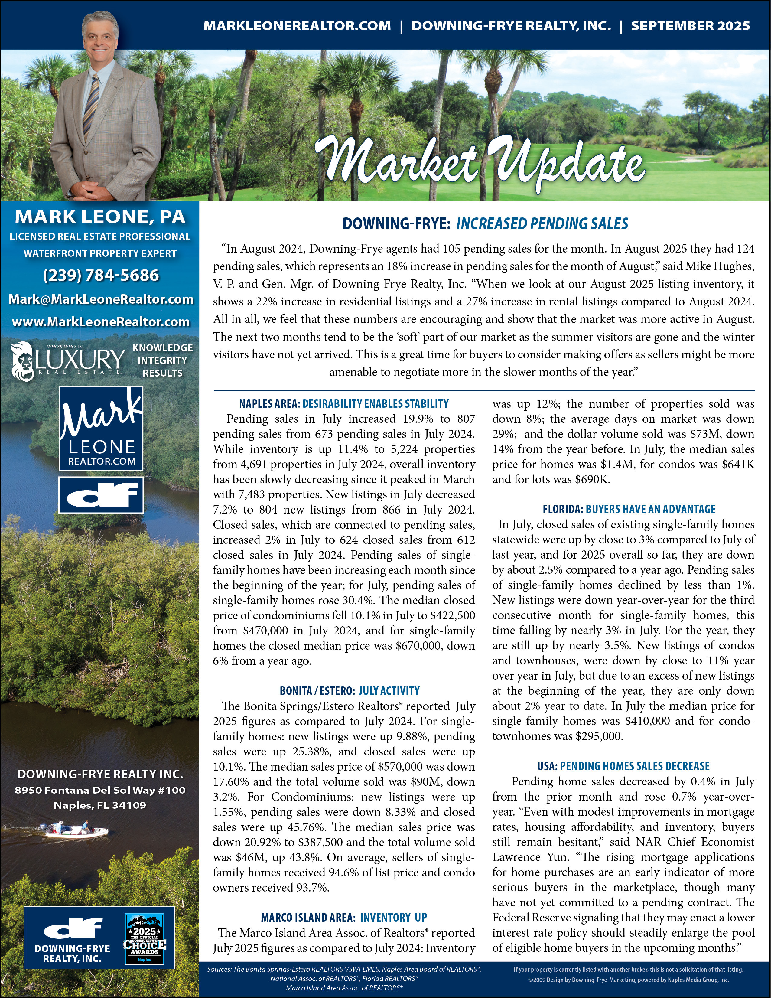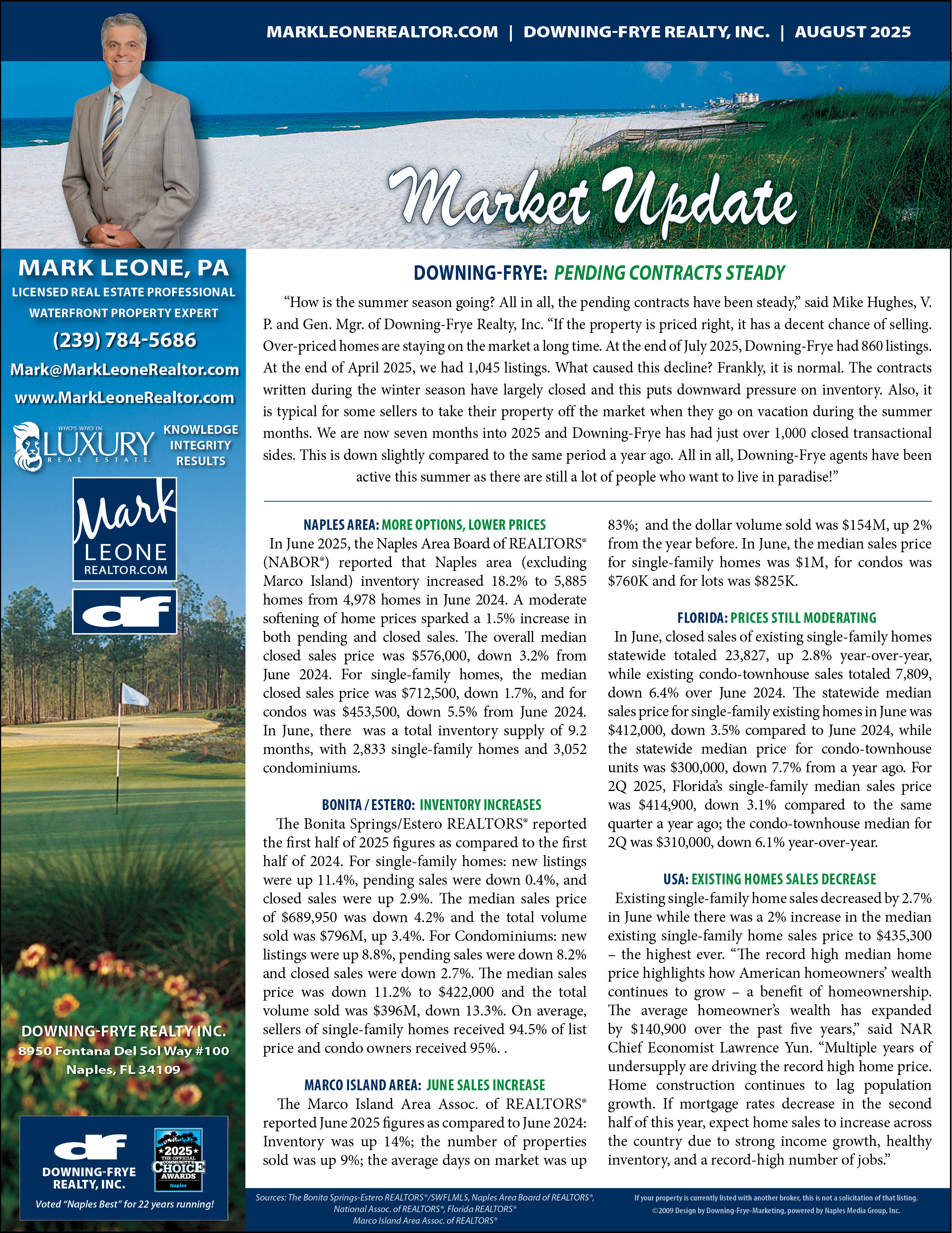 “New listings are coming in daily, but the demand is so strong that they are absorbed very quickly,” said Mike Hughes, Vice President of Downing-Frye Realty, Inc., “If it’s your desire to purchase soon, it would be best to be working with a Downing-Frye agent that is monitoring our daily listing activity because properties are selling about as fast as they come on the market. Some sellers list high and then later reduce their price, while others list lower and then raise their price. In May, the Naples area had as many prices increases as price decreases. Although financing rates remain favorable, most Downing-Frye sales have been cash transactions. During the first half of 2021, we had 2,502 pending sales, which were 64 percent more than the first half of 2020; and 2,335 closings, which were 82 percent more than the first half of 2020. Our 303 pending sale transactions for June at $198 million were 20 percent higher than our average June sales over the last five years. Selling activity is still quite elevated, and the summer buying season has only begun.”